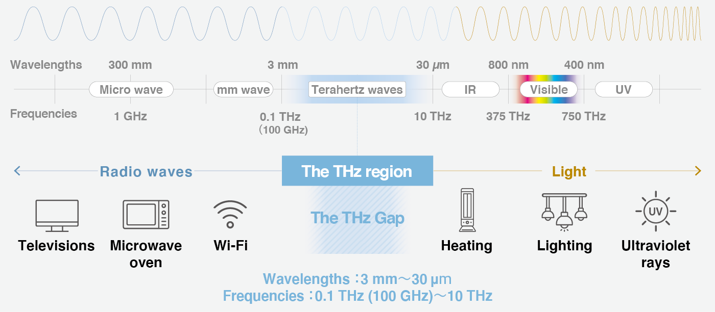 A THz wave is an electromagnetic wave that has the properties of both light and radio waves. Both light and radio waves are electromagnetic waves, with the shorter wavelength region being called light and the longer wavelength region being called radio waves.