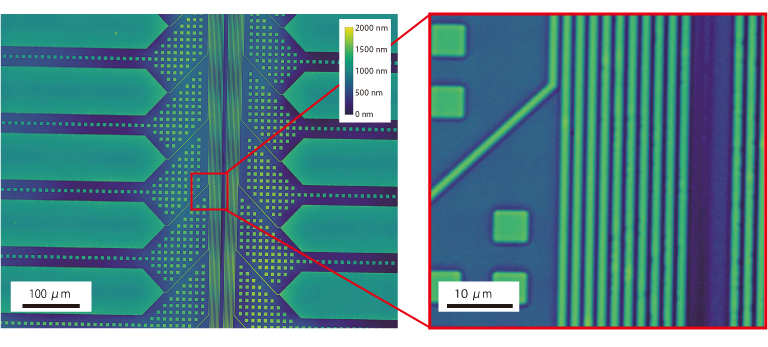 The image on the right shows a TEG (Test Element Group) wafer surface imaged by the QPM optical module. Since a high-definition image can be acquired, the uniformity of fine line width (1um wiring pattern width) can be seen even in a magnified image.