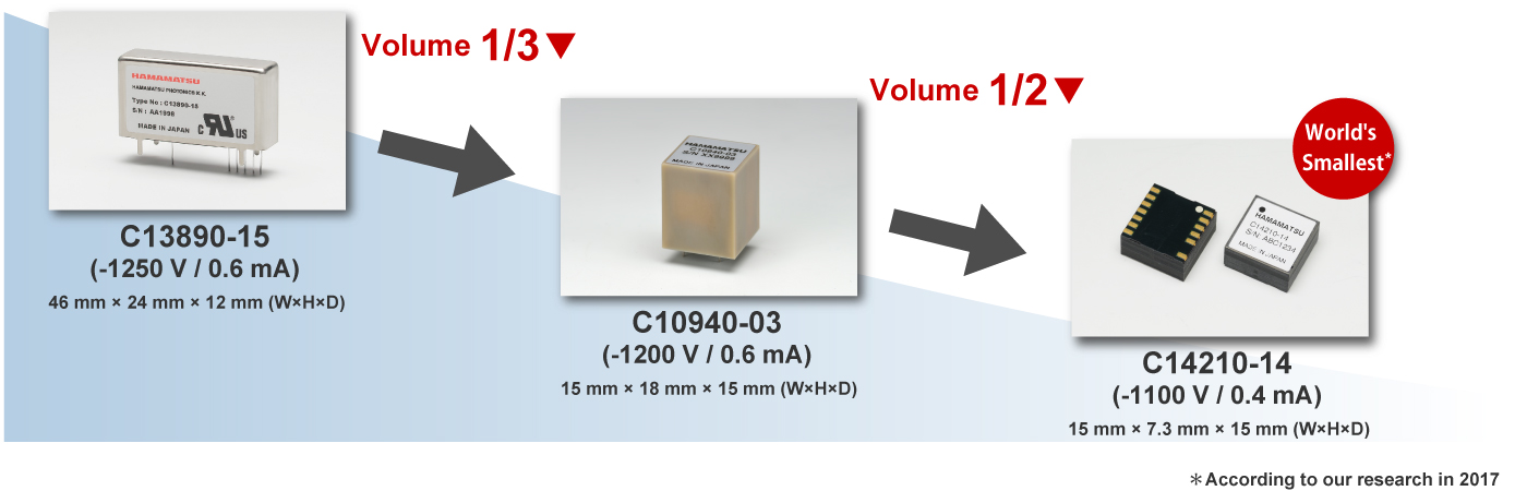 These compact high-voltage power supply modules offer high power efficiency and low heat generation. Our wide line-up includes a variety of models from fingertip size to large current output types.