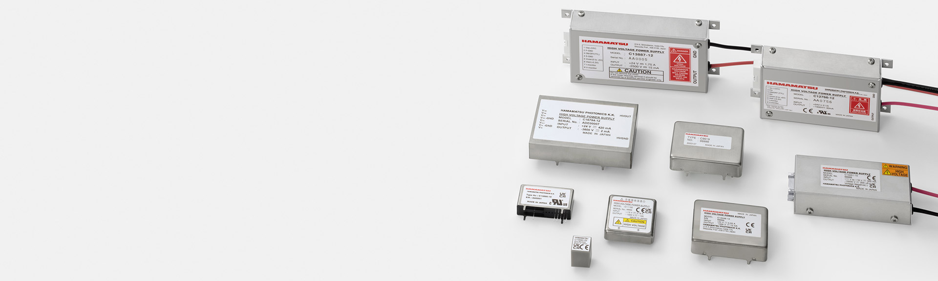 Hamamatsu Photonics offers a wide product line-up ranging from bench-top models to small units that are directly mountable on PC boards. By utilizing our massive experience and achievements gained with power supplies optimized for photomultiplier tube operation, we provide customized high-voltage power supply modules that meet a wide range of user needs for specifications such as number of output channels, input/output voltage and current, operating conditions and profiles, etc. We also support a diverse range of safety standards so please free to contact us for assistance.